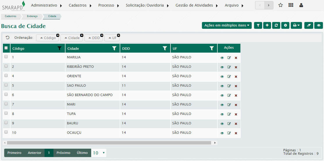 Na lista de cidade, através da coluna Ações, você poderá visualizar, editar e excluir uma cidade registrada no sistema.