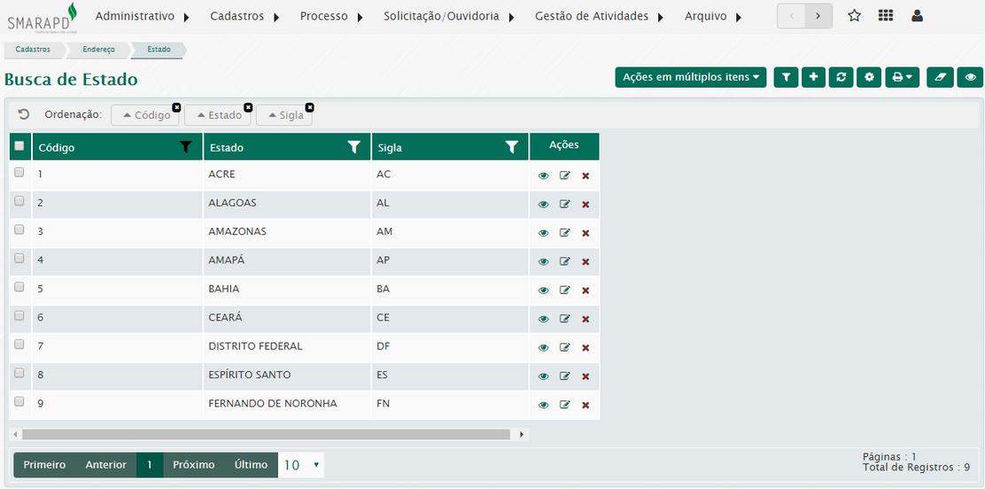 Na lista de estado, através da coluna Ações você poderá visualizar editar e excluir um estado registrado no sistema.