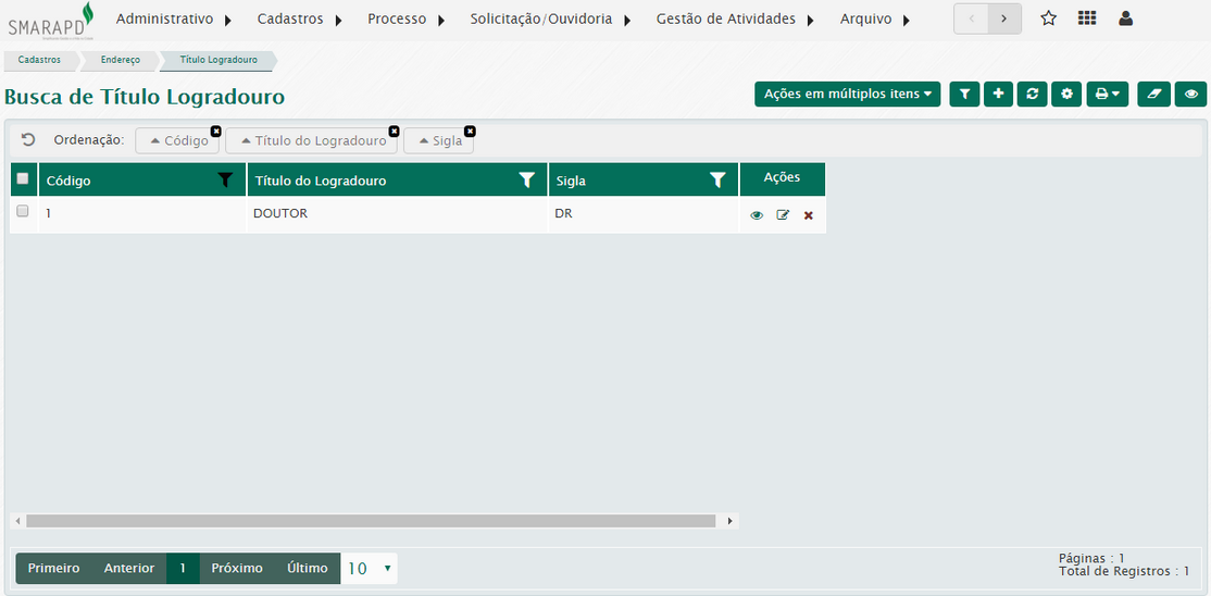 Na lista de títulos de logradouro, através da coluna Ações, você poderá visualizar, editar e excluir um título registrado no sistema.