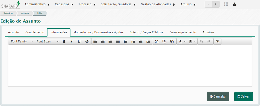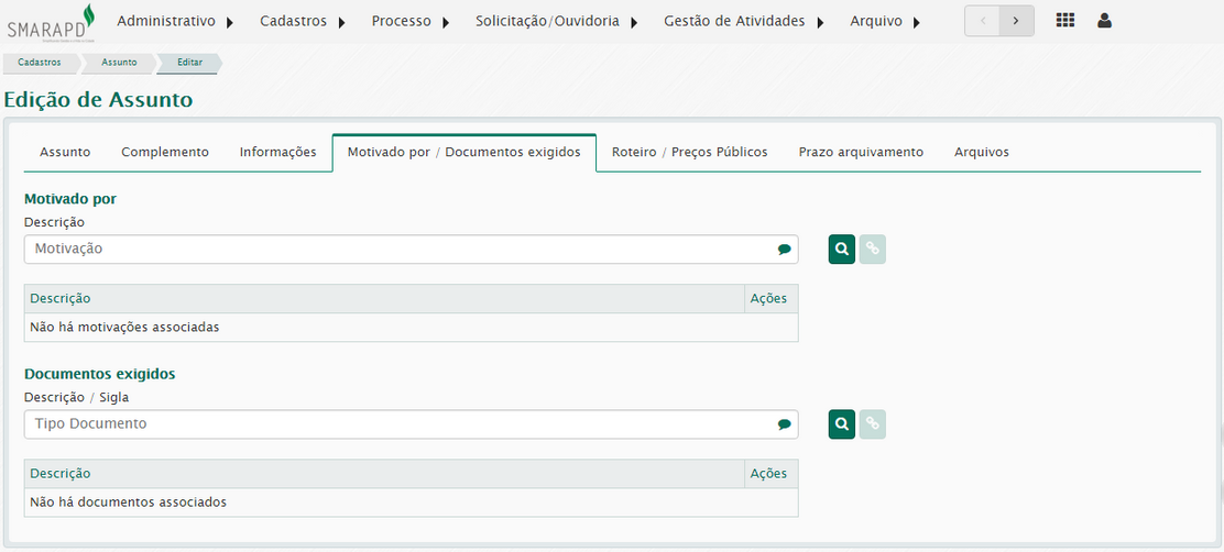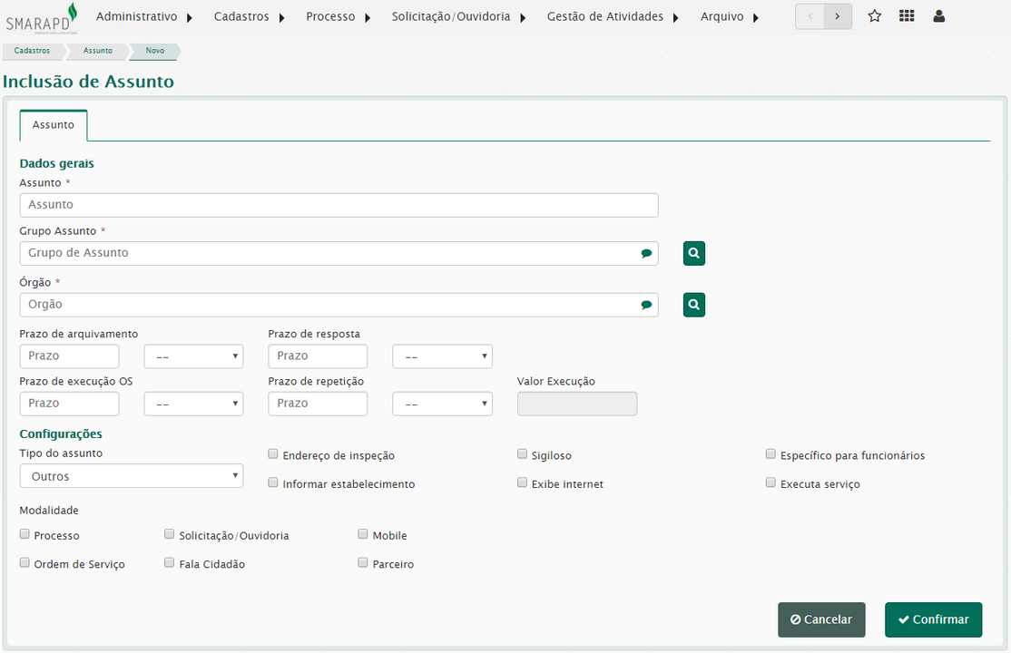 Esta funcionalidade permite registrar a lista de serviços e ações que poderão ser prestados ao cidadão e/ou administração pública. Os assuntos fazem parte de um grupo de assunto, e também estarão sob a responsabilidade de um órgão da administração.