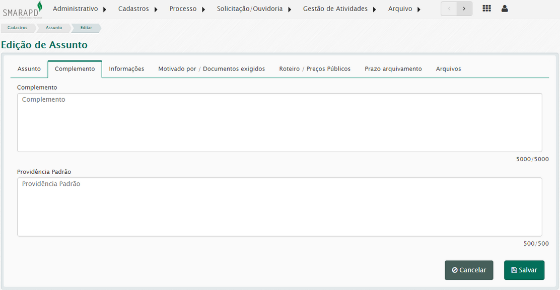 Digitar no campo complemento informações para maior esclarecimento sobre o assunto e em providência padrão, o conteúdo que será associado aos trâmites das demandas que tiverem este assunto associado.