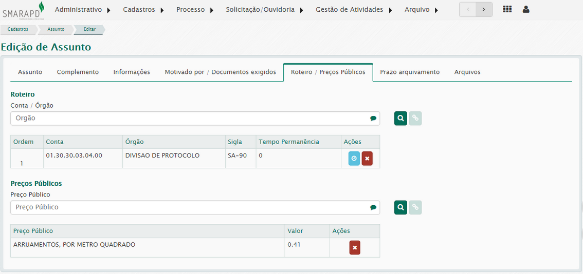 Os órgãos do roteiro e os preços públicos associados ao assunto serão exibidos em lista correspondente e o usuário poderá removê-los se assim for necessário, acionando o botão na coluna ações.