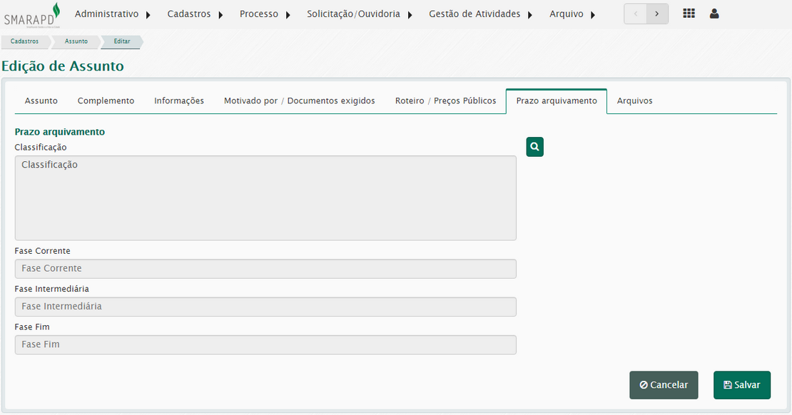 Selecione a classificação de arquivamento que se quer associar ao assunto, quando este for utilizado para autuar um processo.