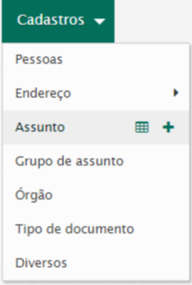 Para incluir um assunto acesse o menu Cadastros / Assunto / Novo.