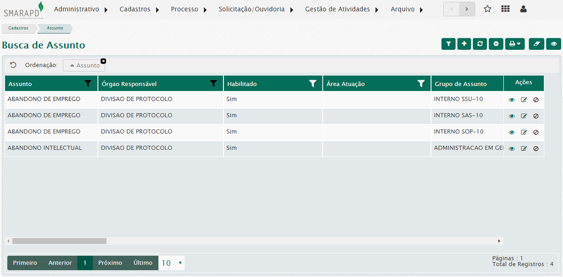 Na lista de assunto, através da coluna Ações, será possível visualizar, editar, desabilitar e habilitar os assuntos registrados no sistema.