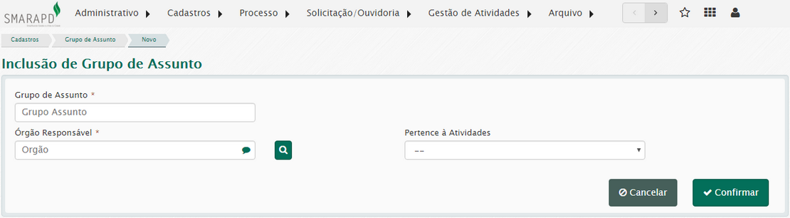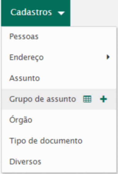 Para incluir um grupo de assunto acesse Cadastros / Grupo de assunto / Novo.