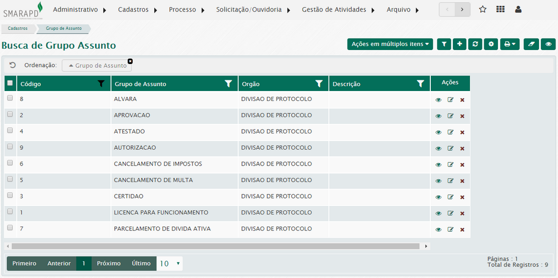 Na lista de grupos de assunto, através da coluna Ações, é possível visualizar, editar e excluir grupos de assunto cadastrados no sistema.