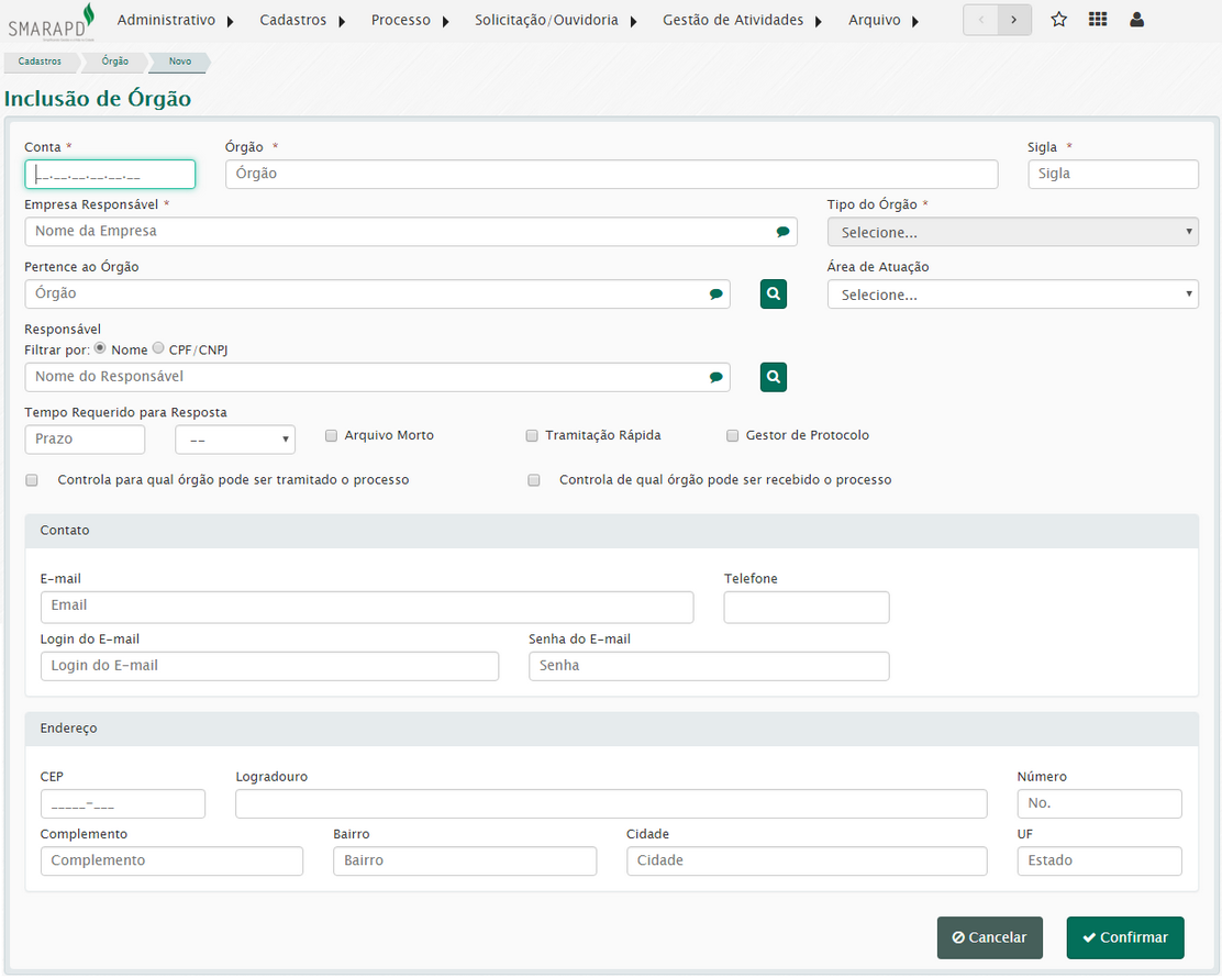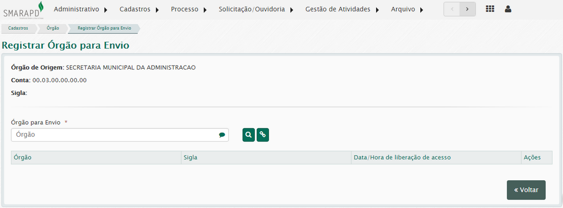 Essa opção permite o registro de locais para onde o órgão poderá enviar/tramitar processos.