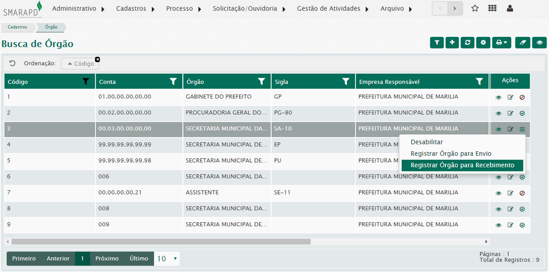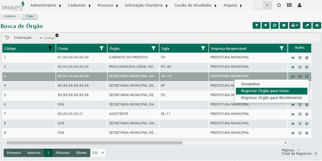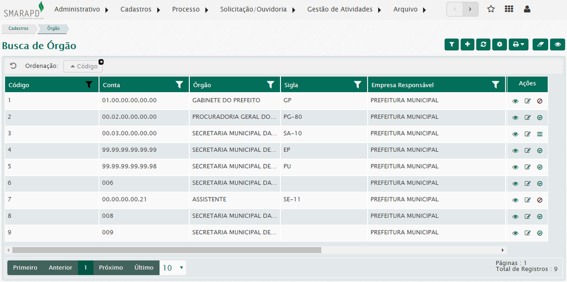 Na lista de órgão, na coluna Ações, você poderá visualizar editar, desabilitar e habilitar órgãos cadastrados no sistema.