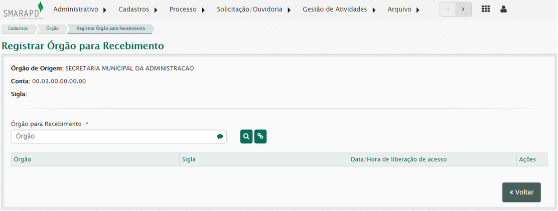 Essa opção permite o registro de locais de onde o órgão poderá receber processos.
