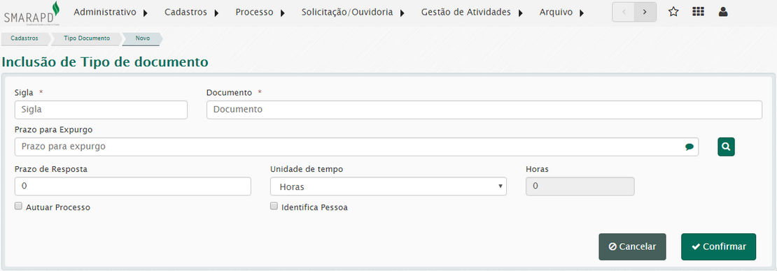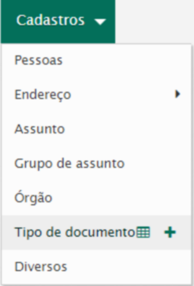 Para incluir um tipo de documento acesse Cadastros / Tipo de documento / Novo.