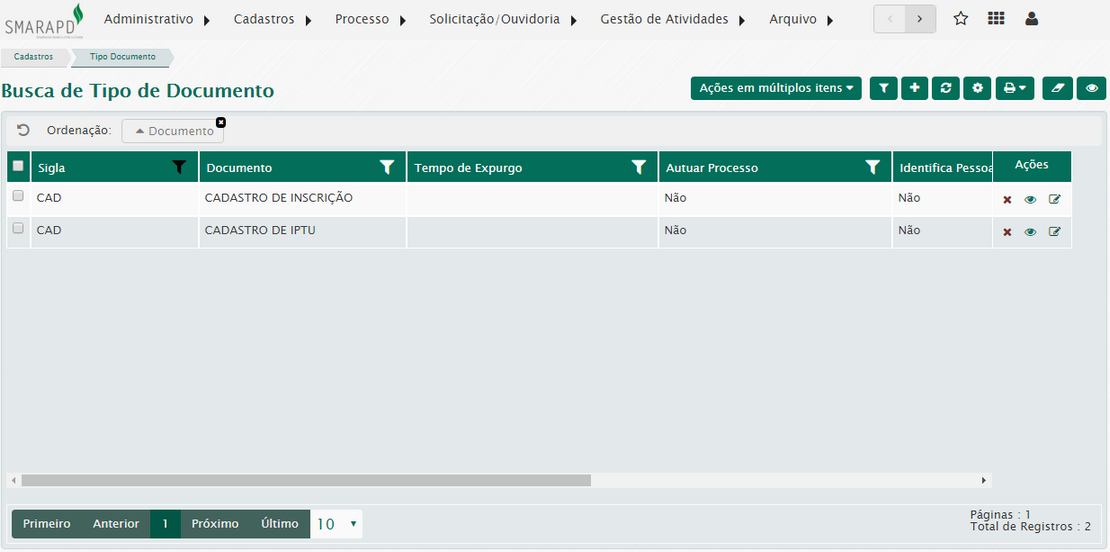 Na lista de tipo de documento, através da coluna Ações, você poderá visualizar, editar e excluir tipos de documentos cadastrados no sistema.