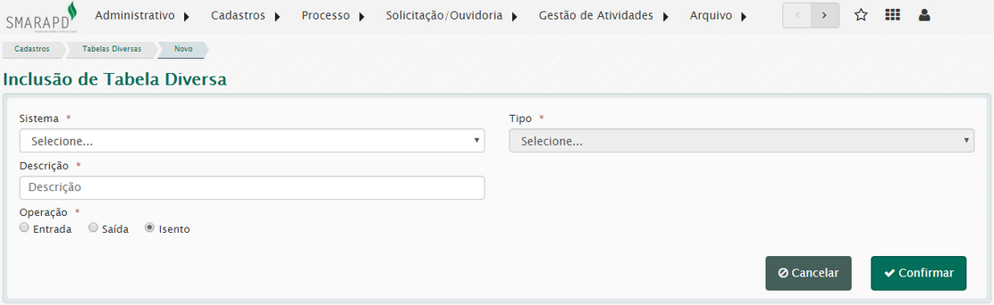 Esta funcionalidade permite incluir registros nesta tabela que contém diversas configurações agrupadas, por sistemas e tipo. Esta é uma tabela criada e controlada pela SMARAPD, sendo os sistemas e tipos definido por ela.
