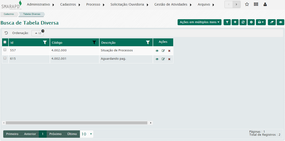 Na lista de tabela diversa, na coluna Ações, você poderá visualizar, editar e excluir registros da tabela diversa.