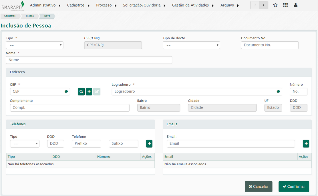 Esta funcionalidade permite registrar uma pessoa física ou jurídica que será um requerente de demandas ou ordens de serviço que serão executadas pela Administração que utiliza o sistema SMARsa.