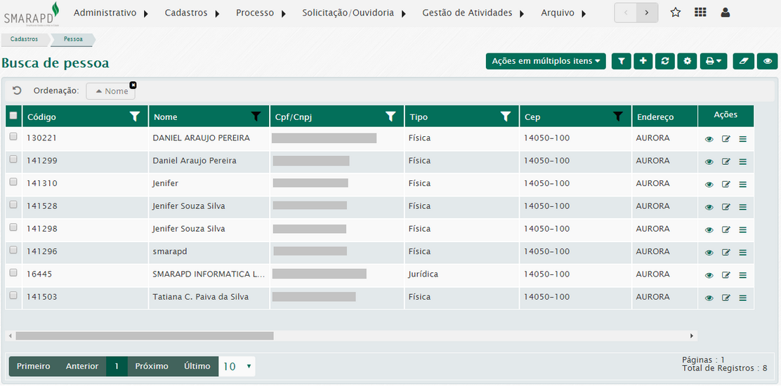 Na lista de pessoas, através da coluna ações, você poderá visualizar, editar e excluir pessoas cadastradas no sistema.