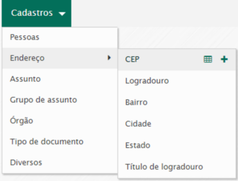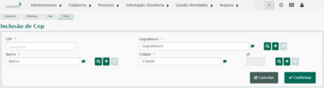 Para a inclusão de um CEP, deve-se ter previamente cadastrado o logradouro, bairro e cidade.
