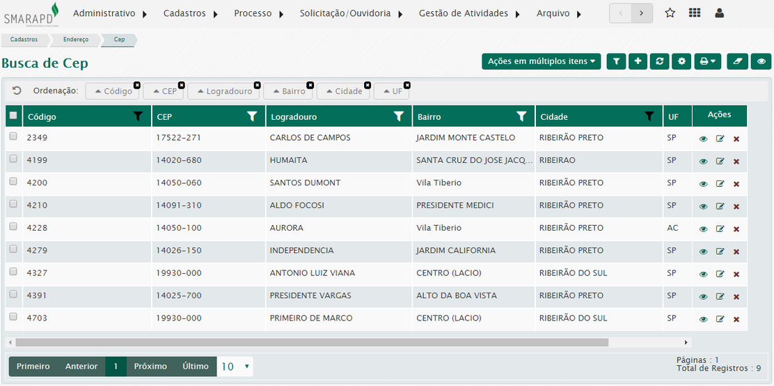 Na lista de CEP, através da coluna Ações, você poderá visualizar editar e excluir um CEP registrado no sistema.