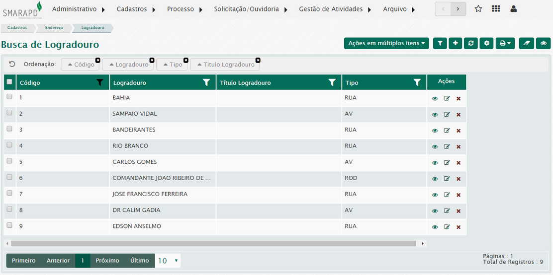 Na lista de logradouro, através da coluna Ações, você poderá visualizar editar e excluir um logradouro registrado no sistema.