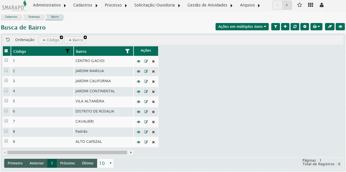 Na lista de bairro, através da coluna Ações, você poderá visualizar, editar e excluir um bairro registrado no sistema.