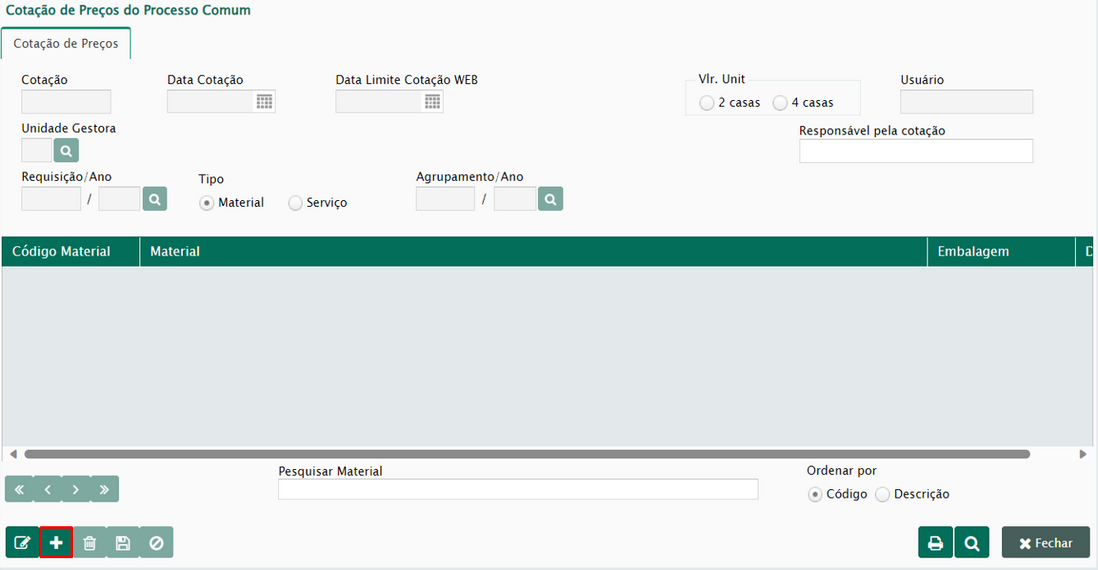 - Cotação de Preços – É o menu principal, ele irá se comunicar diretamente com a requisição ou agrupamento referente ao seu processo licitatório no sistema de materiais SMARam.