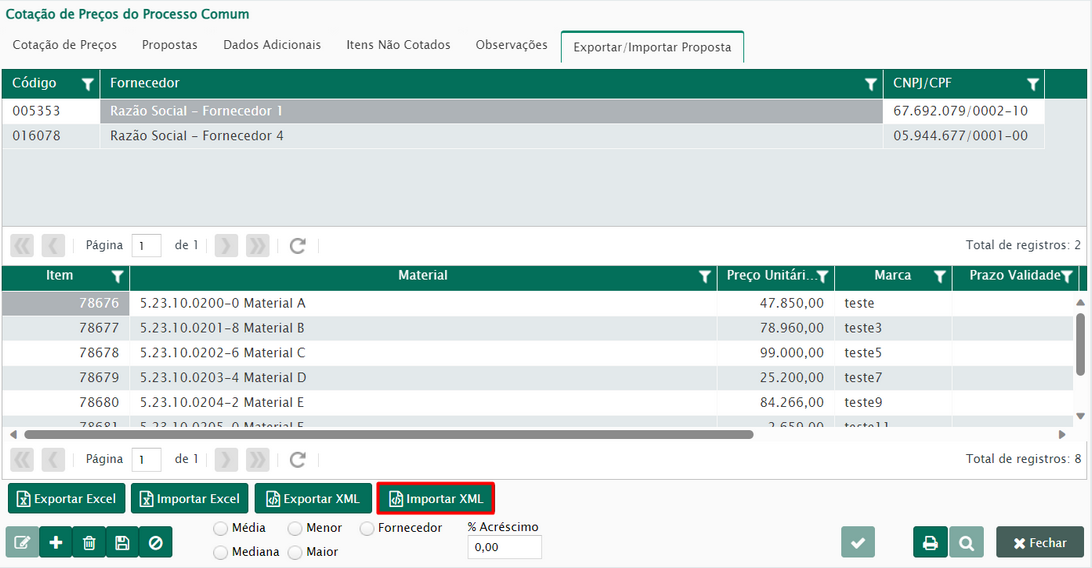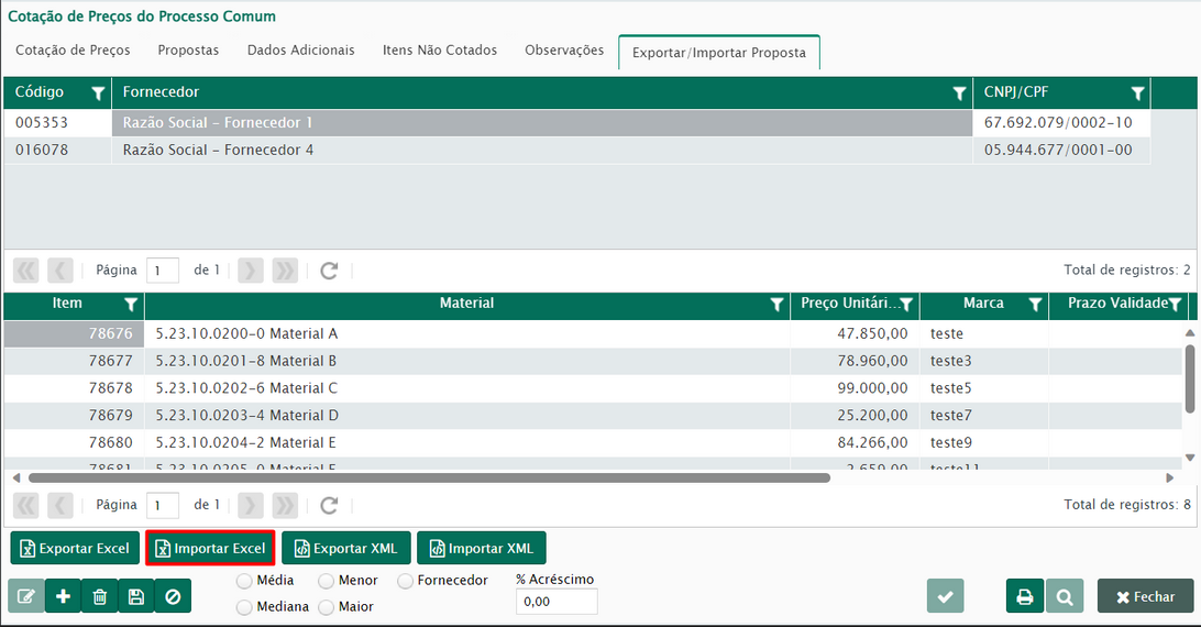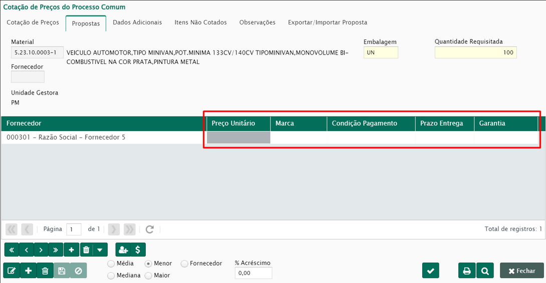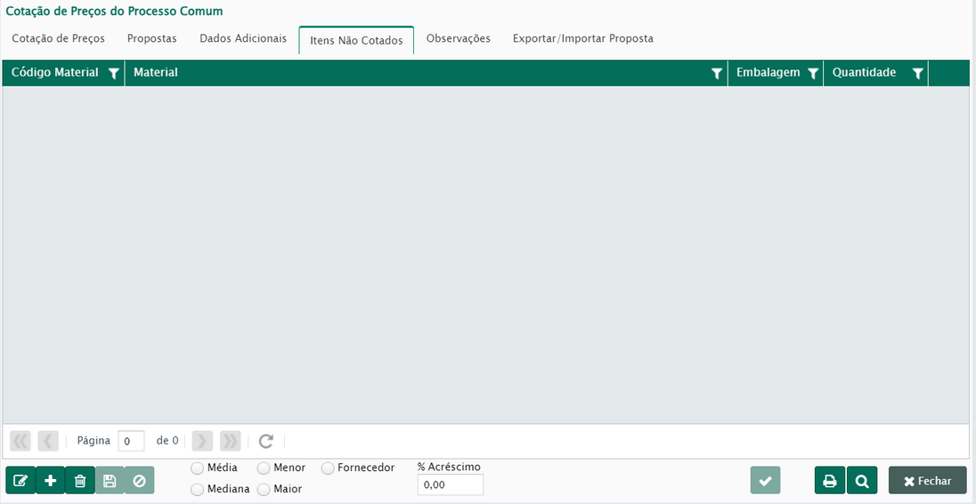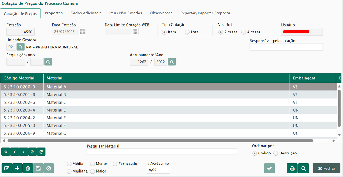 Após a conferência dos materiais da cotação, chegou a hora de realizar os procedimentos na aba proposta, onde será possível inserir os fornecedores e suas propostas para os itens da cotação.