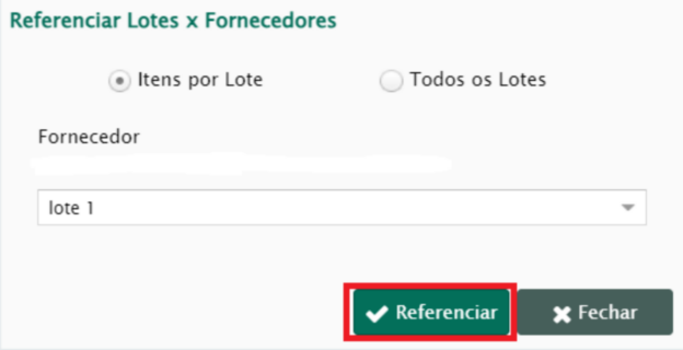 Após a seleção do fornecedor, aparecerá uma nova janela, onde o sistema irá perguntar se deseja referenciar o fornecedor em itens por lote ou se será para todos os lotes daquela proposta. Após escolha, clicar no botão referenciar (Figura 10).