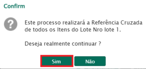 O sistema então informa que será realizada a referência cruzada para todos os itens selecionados conforme populado na imagem anterior, e pergunta se realmente deseja continuar.