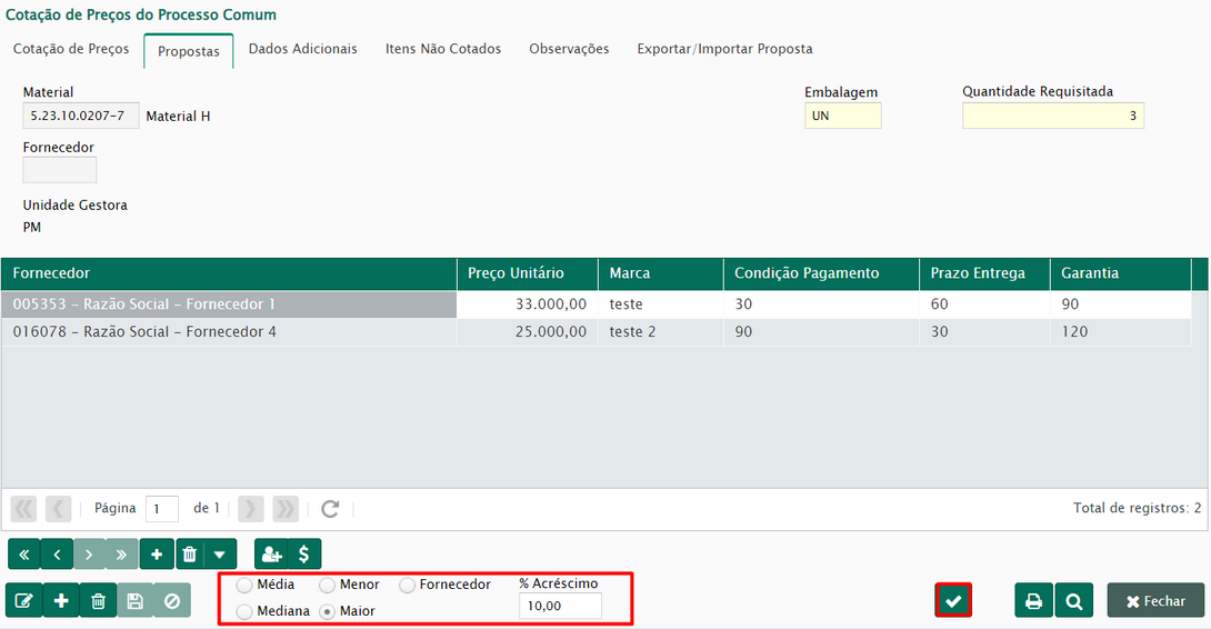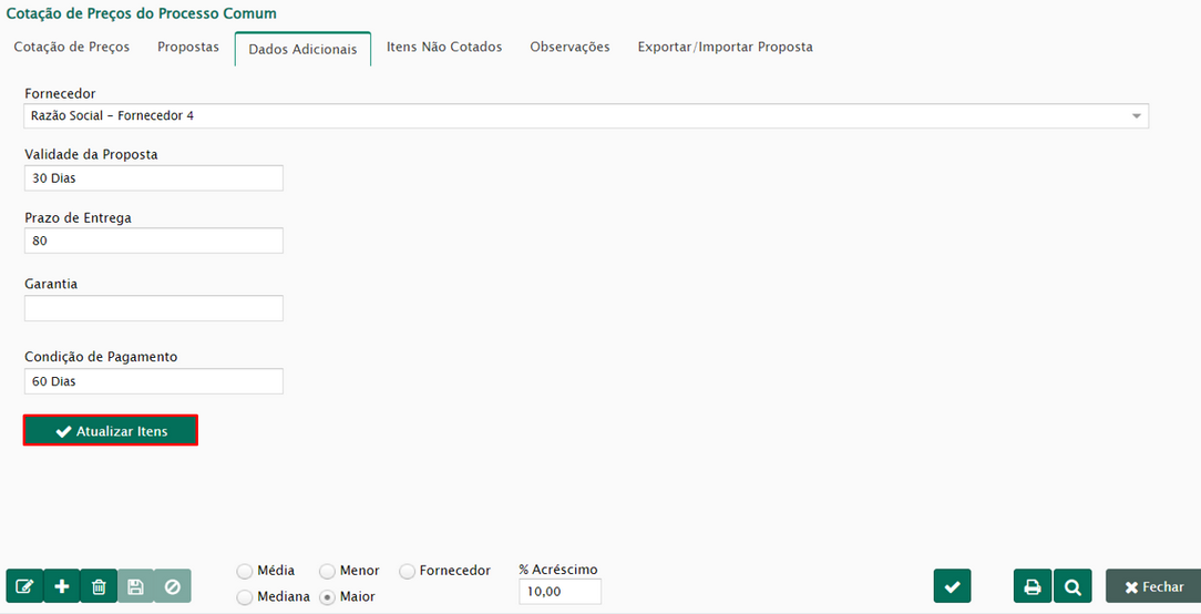 Após as propostas serem preenchidas, o usuário poderá optar de que maneira os preços impactarão na requisição, se será realizado uma média ou mediana, o menor, ou maior valor, ou se será por fornecedor. Pode-se também incluir uma margem de acréscimo, para que seja efetuado reservas sem valores faltantes.