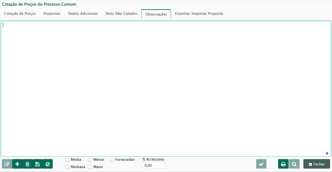 Na aba de observações, o usuário tem a oportunidade de inserir informações relevantes relacionadas ao processo de cotação em questão. Isso inclui detalhes sobre os itens, anotações específicas sobre fornecedores ou qualquer outra informação relevante a cotação. (Figura 16).