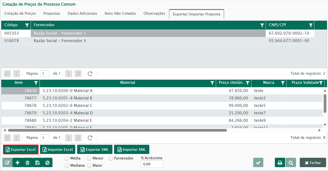 Nesta janela, o usuário tem a opção de exportar todo o processo de cotação. Isso pode ser útil caso ele queira enviar as informações aos fornecedores envolvidos ou a qualquer outro setor que utilizará os mesmos itens em um processo futuro.