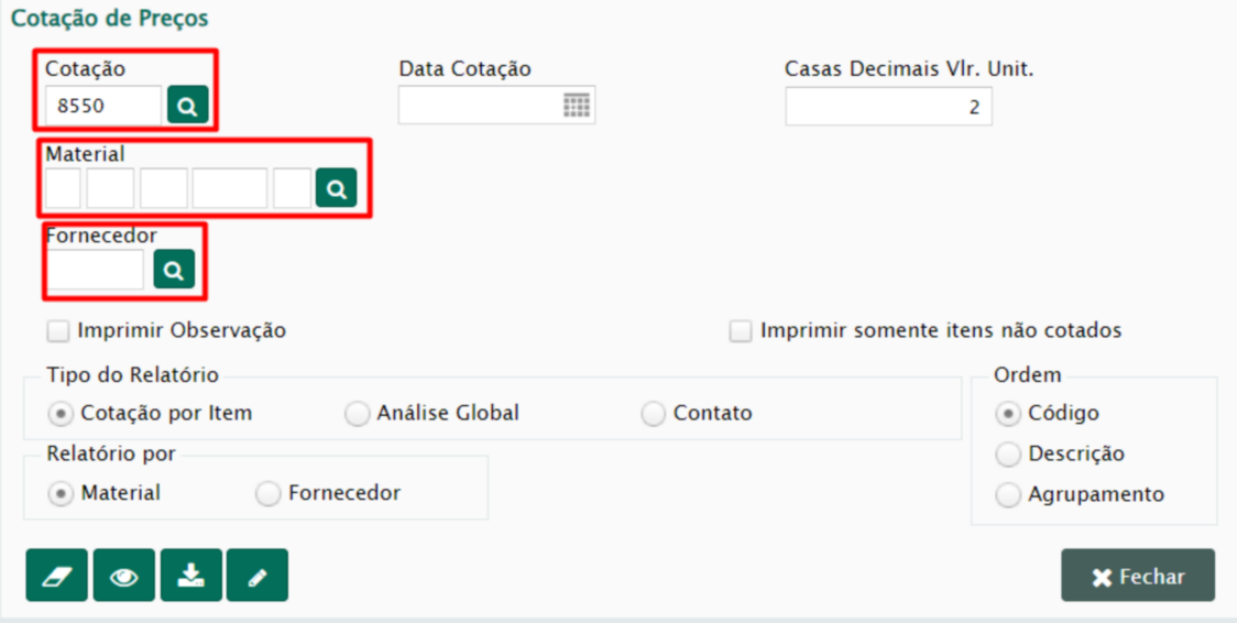 Nesse relatório será possível ver como ficou a cotação de preço já preenchida e relacionada a requisições de materiais/serviços, podendo-se alterar a ordem (Código, Descrição ou Agrupamento), por material ou fornecedor, e o Tipo do relatório (Cotação por item, análise global ou Contato).