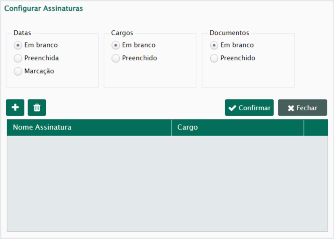 O usuário deverá incluir a assinatura e informar se deseja Datas, e Cargos preenchidos ou em branco (Figura 27).