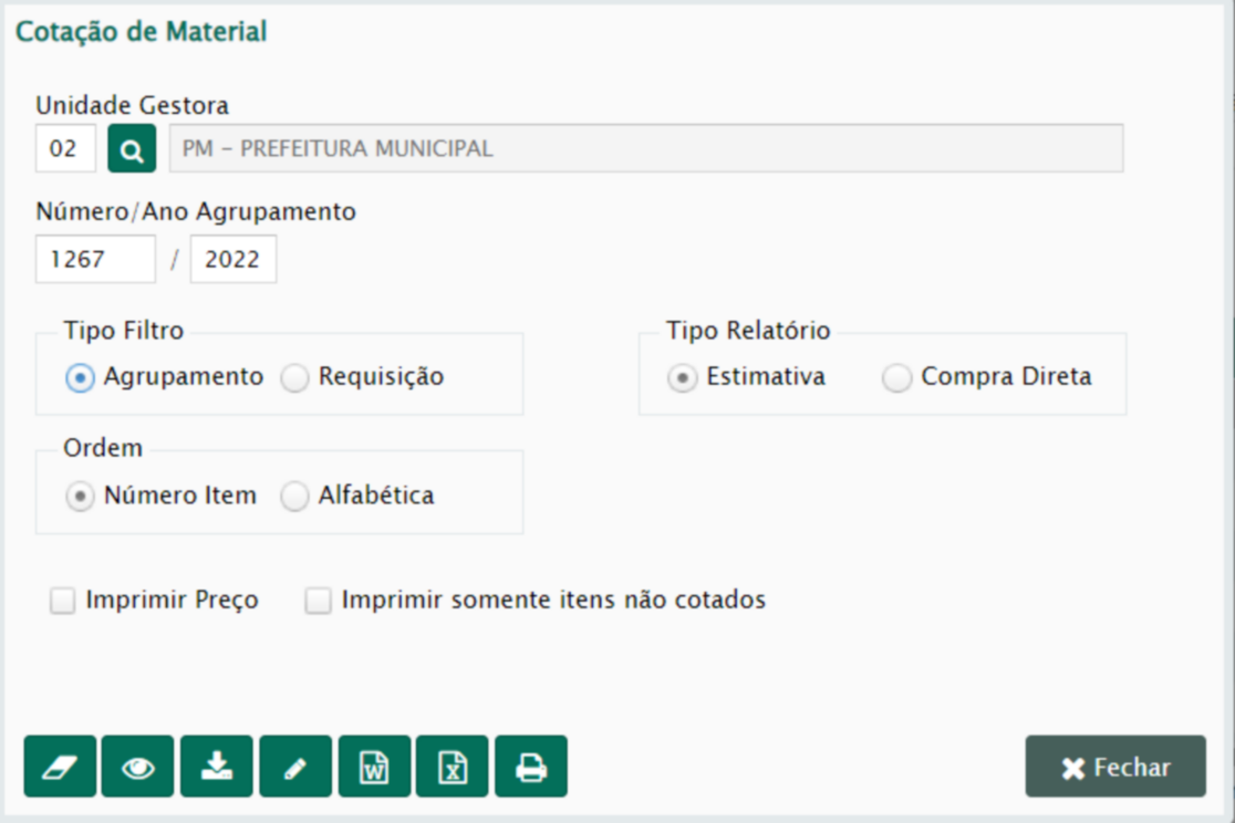 Esse relatório não tem filtros, é gerado em .PDF retirando as informações referente a quantidade, descrição e valor médio pesquisado no mercado dos materiais da cotação.