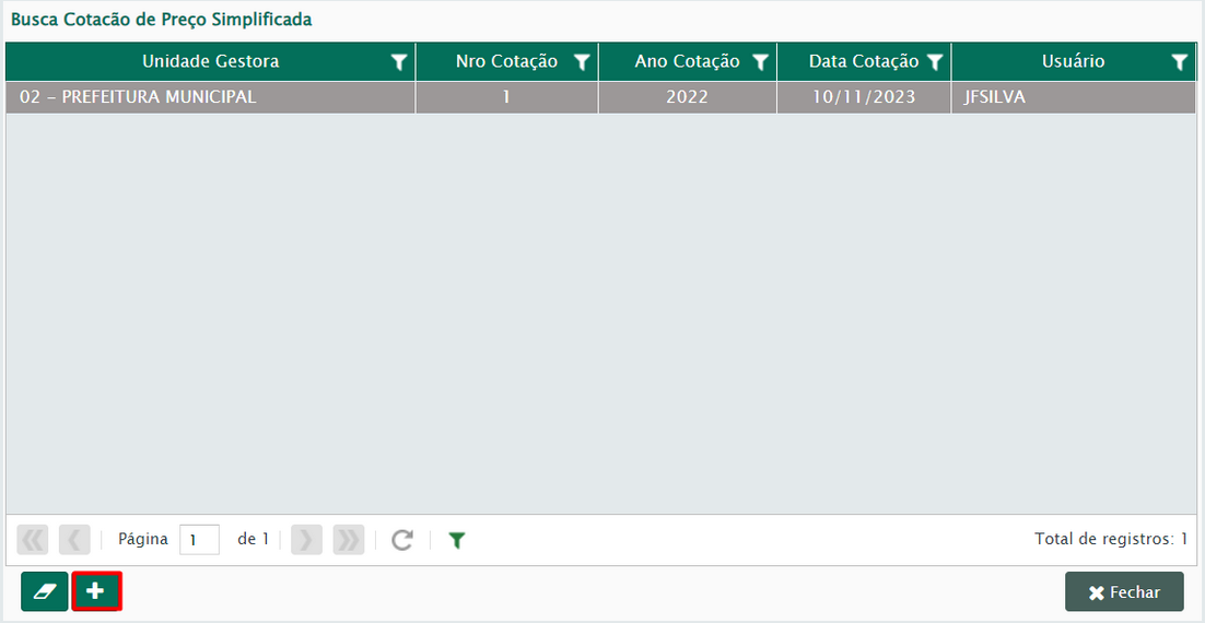 Caso o usuário já tenha realizado a inserção de uma cotação e deseja alterar os itens da mesma deverá apertar o botão pesquisar (Figura 5), ao invés de clicar em inserir um novo registro.
