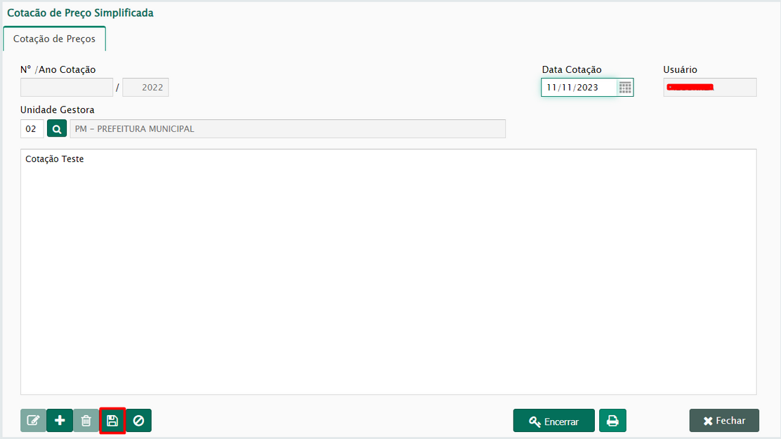 Informar a Unidade Gestora e Data da Cotação. Para se organizar melhor entre as cotações simplificadas, é sugerido a criação de um texto informando a necessidade, os itens e até mesmo o motivo da cotação.