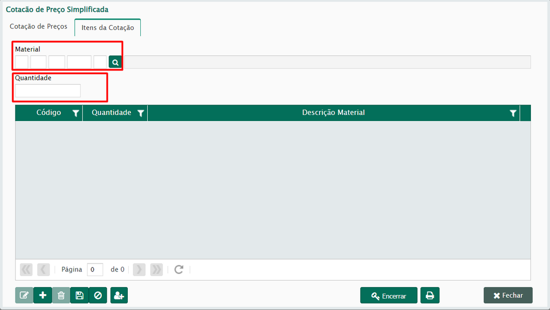 Após salvar, será liberada a aba Itens da Cotação. Nessa seção, o usuário deverá informar todos os itens da cotação, pesquisando pelo material na lupa e indicando a quantidade que será cotada. (Figura 31).