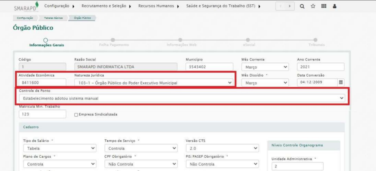 Atenção: Desde 2013 a informação “Controle de Ponto” deve ser informada no arquivo. Antes do início da geração da RAIS o usuário deverá verificar esta informação. No “Órgão Publico”, verificar a opção que condiz com o ponto utilizado, conforme Figura A: