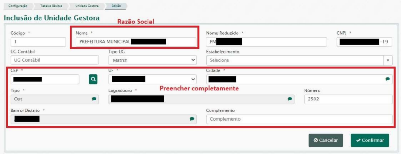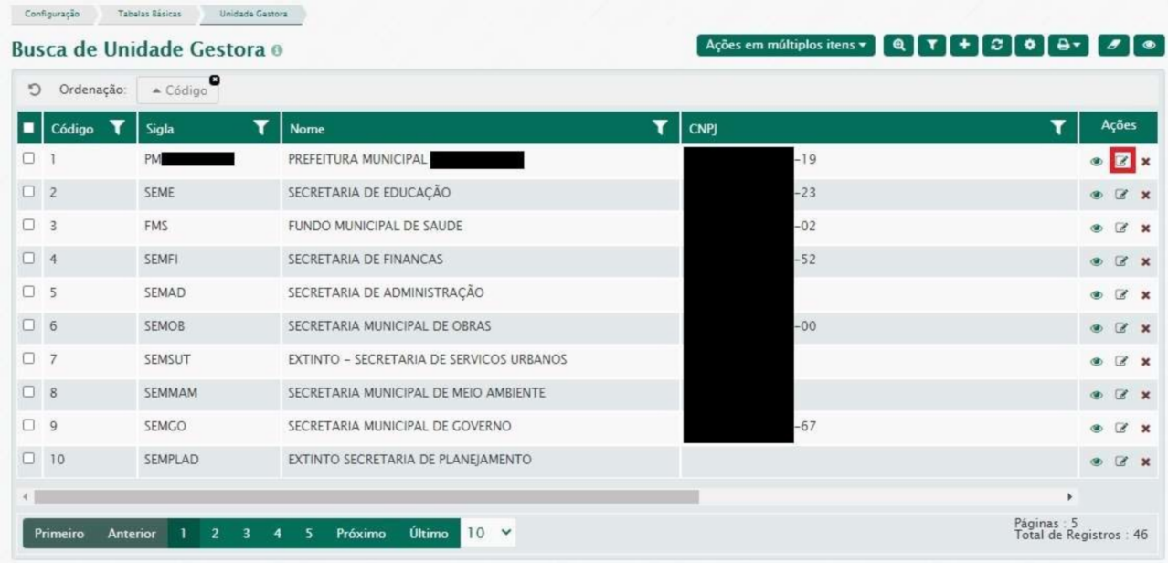 IMPORTANTE: Será necessário o cadastro completo da Unidade Gestora para que as informações saiam completas no layout do arquivo RAIS.txt. É imperativo acessar o cadastro de unidade gestora e completá-lo com as informações que estarão faltantes, INCLUSIVE o endereço (Configuração > Tabelas Básicas > Unidade Gestora > Aplicar Filtro > Editar – Figura B) e seguir com o processo após as alterações, pois todos os dados do controle serão definidos por este cadastro, incluindo a Razão Social (que deverá ser alterada, se necessário) (Figura C).