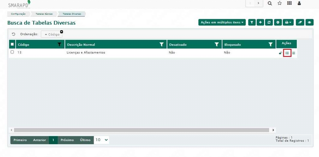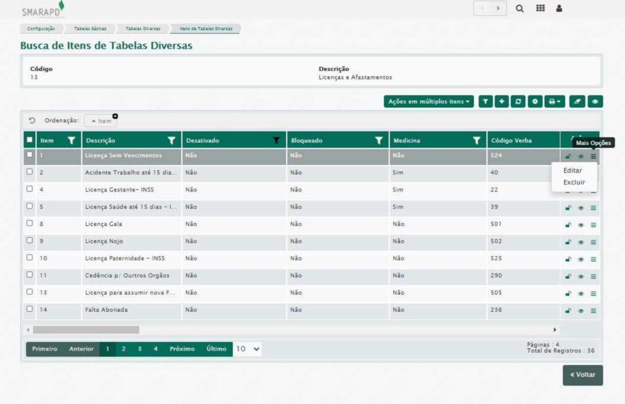 Acessando o menu Tabelas Diversas (Configuração > Tabelas Básicas > Tabelas Diversas), filtrar o campo “Código” e informar o código 13 (que se refere à tabela de Licenças e Afastamentos) e clicar no botão “Itens” referente a este registro, localizado no canto direito da linha(Figura 2).