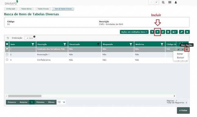 Depois de ajustar os códigos da RAIS em “Licenças e Afastamentos”, o segundo item de configuração refere-se ao CNPJ das Entidades Sindicais que serão geradas na RAIS. O processo é como o anterior: o usuário deve filtrar em Tabelas Diversas (Configuração > Tabelas Básicas > Tabelas Diversas) o código 53 (CNPJ – Entidade da RAIS), acessar a lista dos itens da tabela (Figura 5) e incluir um novo registro ou alterar os registros existentes (Figura 6) para associar a verba de desconto da Contribuição Sindical em Folha de Pagamento ao Sindicato correspondente.