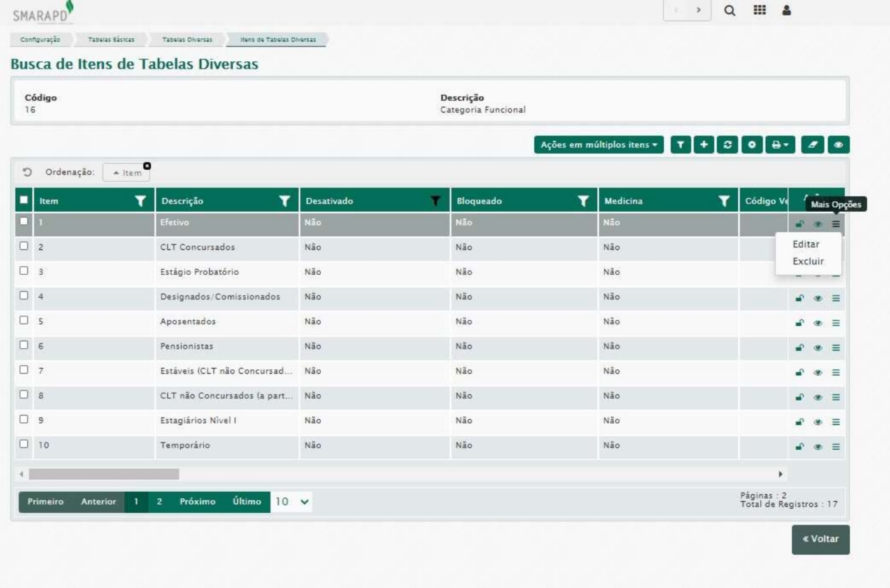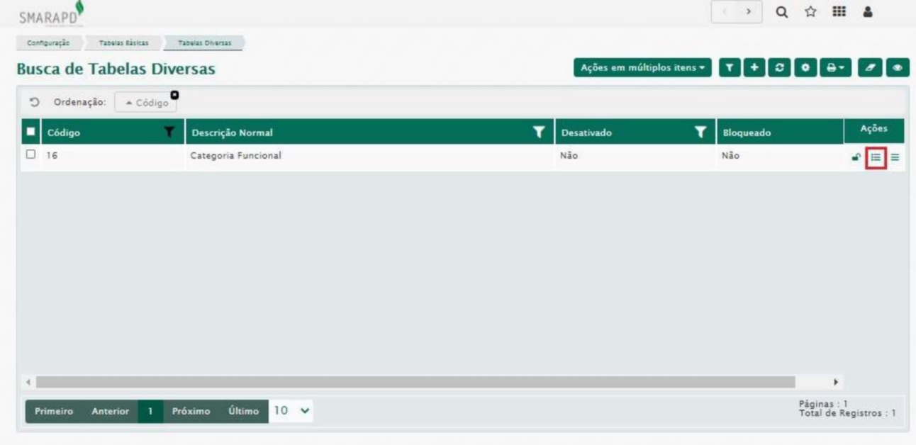 Outra configuração importante necessária antes da geração do arquivo RAIS.txt é identificar quais as categorias funcionais que entram para a RAIS. Para isso, ainda em Tabelas Diversas, informar o código 16 no filtro (Figura 8) e acessar a lista dos itens deste código. O sistema apresentará a lista contendo todas as “Categorias Funcionais” cadastradas (Figura 9), e o usuário deve escolher a categoria funcional desejada e alterar o registro.