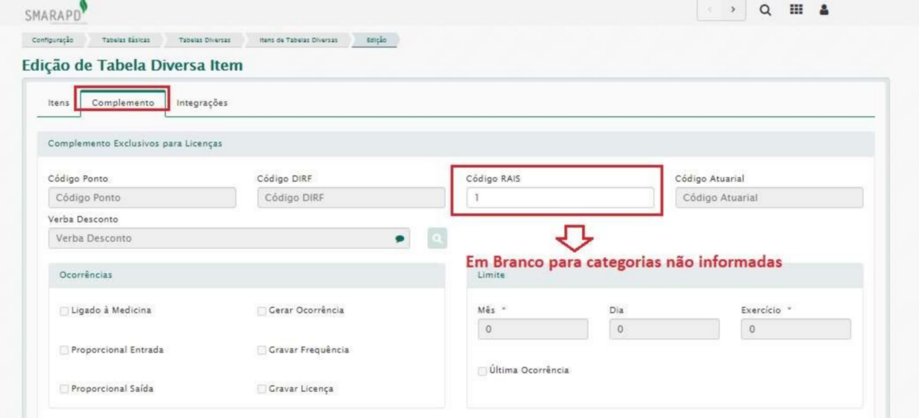 As categorias que devem ser informadas na RAIS devem ser identificadas com o código 1 no campo “Código RAIS” (Figura 10), e as categorias não informadas na RAIS devem ter este campo em branco.