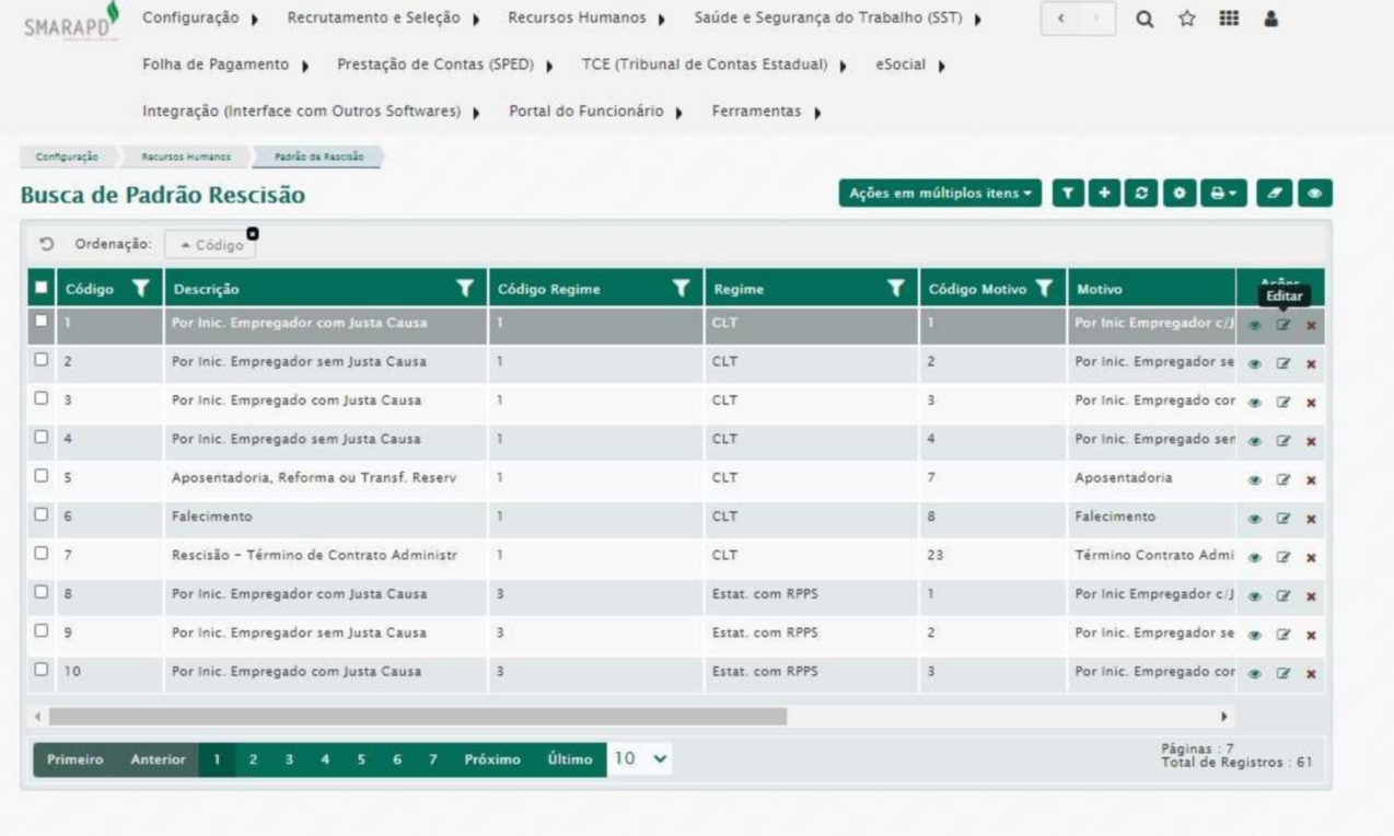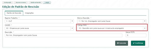O próximo passo é configurar os códigos RAIS para motivos de Rescisão utilizados no ano de 2021. O usuário deve acessar o item de menu “Padrão de Rescisão” (Configuração > Recursos Humanos > Padrão de Rescisão) e ao deixar o filtro em branco nesta tela, todos os padrões de rescisão cadastrados serão exibidos na lista. Através do botão “editar” o usuário deve informar o Código RAIS no padrão de desligamento, de acordo com a legislação vigente (Figuras 11 e 12).
