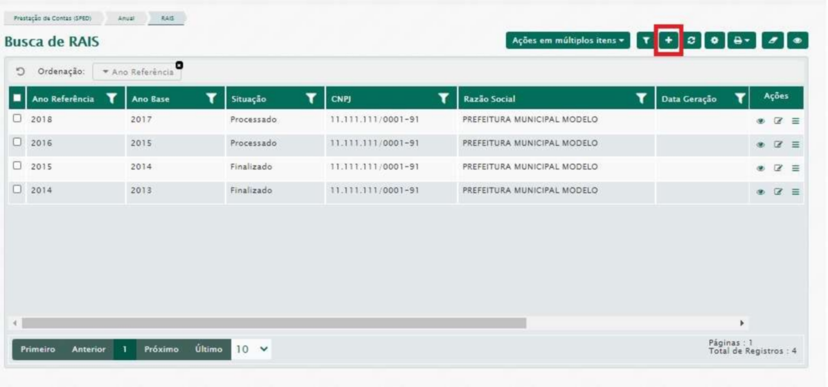 A tela de geração dos dados da RAIS está localizada no menu Prestação de Contas > Anual > RAIS. Acessando esta opção usuário deverá incluir o Declarante da RAIS 2021, clicando no botão de inclusão (Figura 13).