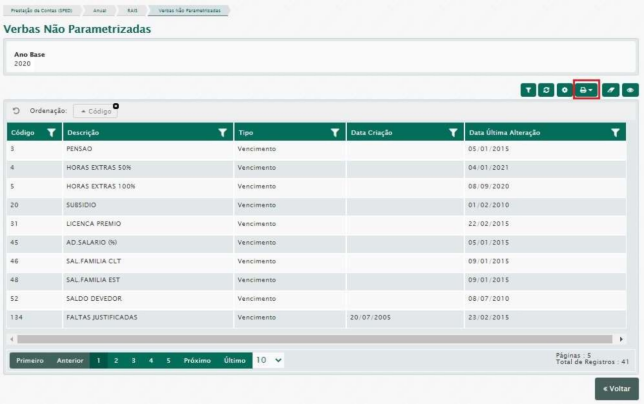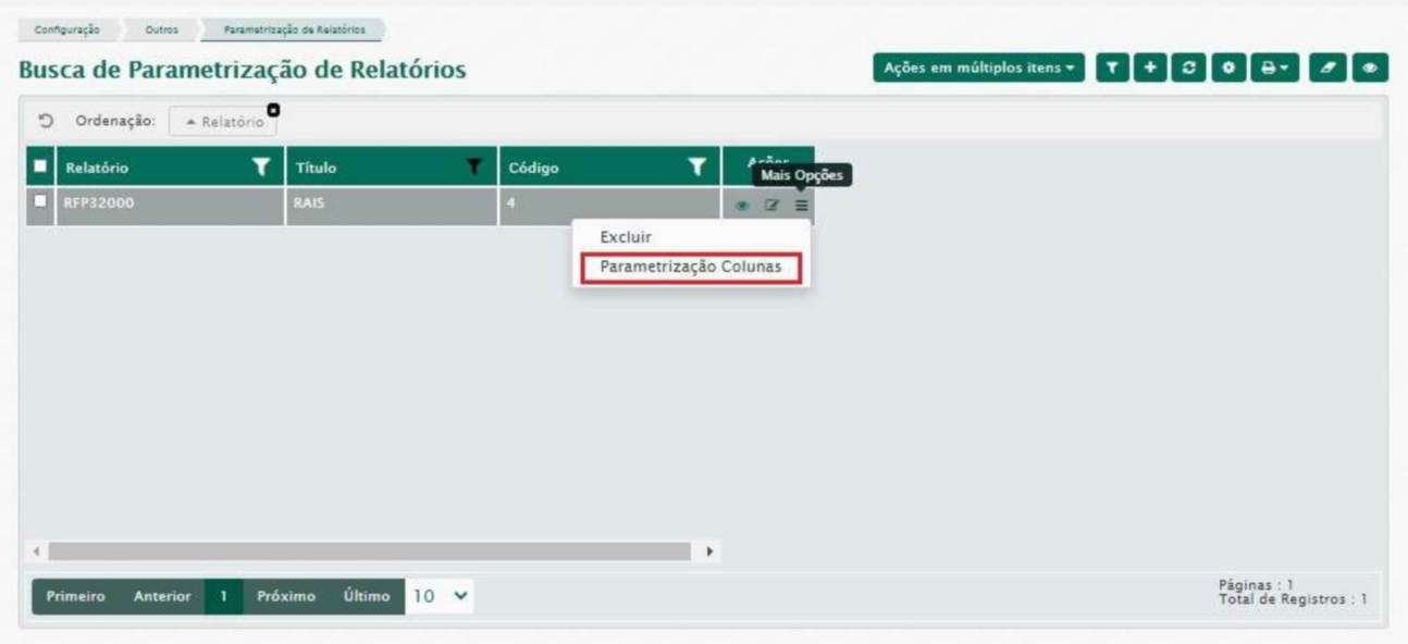 As verbas que constam nesta tela podem ser exportadas ou impressas em forma de lista (no botão “impressora”, em destaque na figura 16). Caso seja necessário parametrizar alguma verba na geração dos dados da RAIS, acessar a Parametrização através do menu Parametrização de Relatórios (Configuração > Outros > Parametrização de Relatórios). Na tela que se abrirá, filtrar na coluna Título por “Rais” e acessar o menu “Parametrização Colunas” através do botão “Mais Opções”.