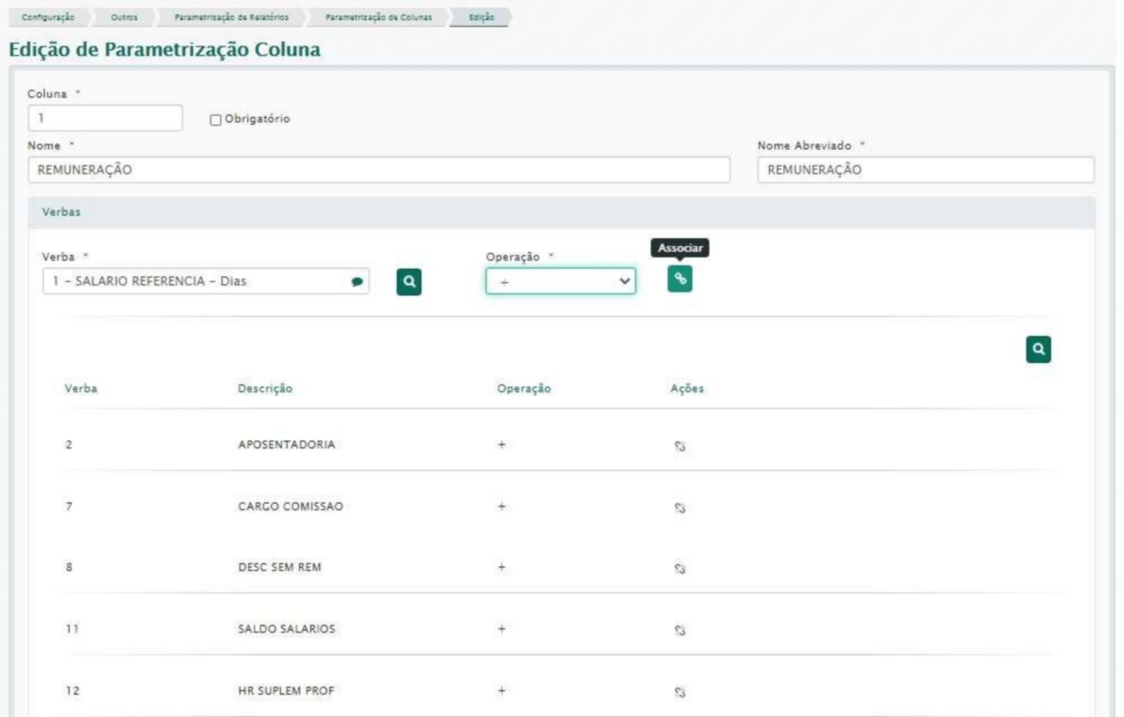 Usuário deve acessar através do botão “Editar” a coluna correspondente a verba que deseja parametrizar. Na tela de edição, usuário deve informar a verba que deseja incluir na relação da RAIS e selecionar a operação (somar o valor na coluna selecionada, ou subtrair) (Figura 19).