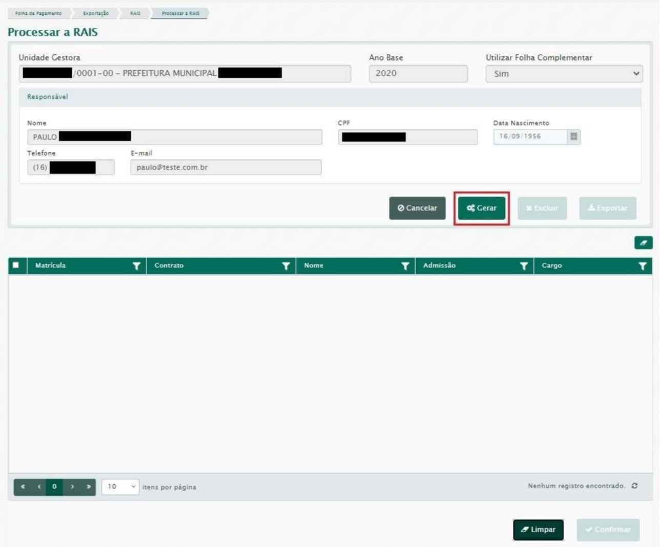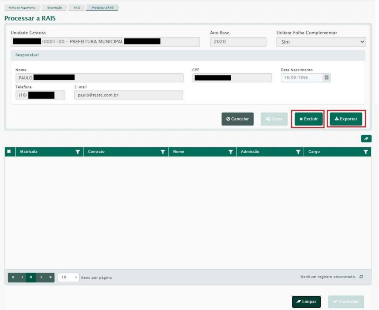 Para exportar os dados gerados, após conferência, usuário deve retornar à tela principal da rotina, acessar o menu “Processar a Rais” através do botão “Mais Opções” e seguir com a exportação.
