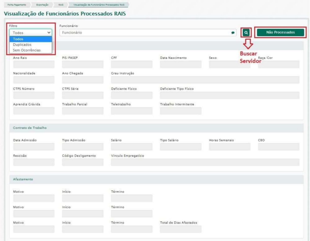 Esta tela permite a verificação dos funcionários cujas informações de 2021 foram geradas para gravação no arquivo RAIS.txt (Figura 25). As verificações podem ser feitas através do filtro de todos os servidores, registros Duplicados ou Sem Ocorrências. Para consultar os contratos não gerados para exportação do RAIS.txt basta clicar no “Não Processados” desta mesma tela.