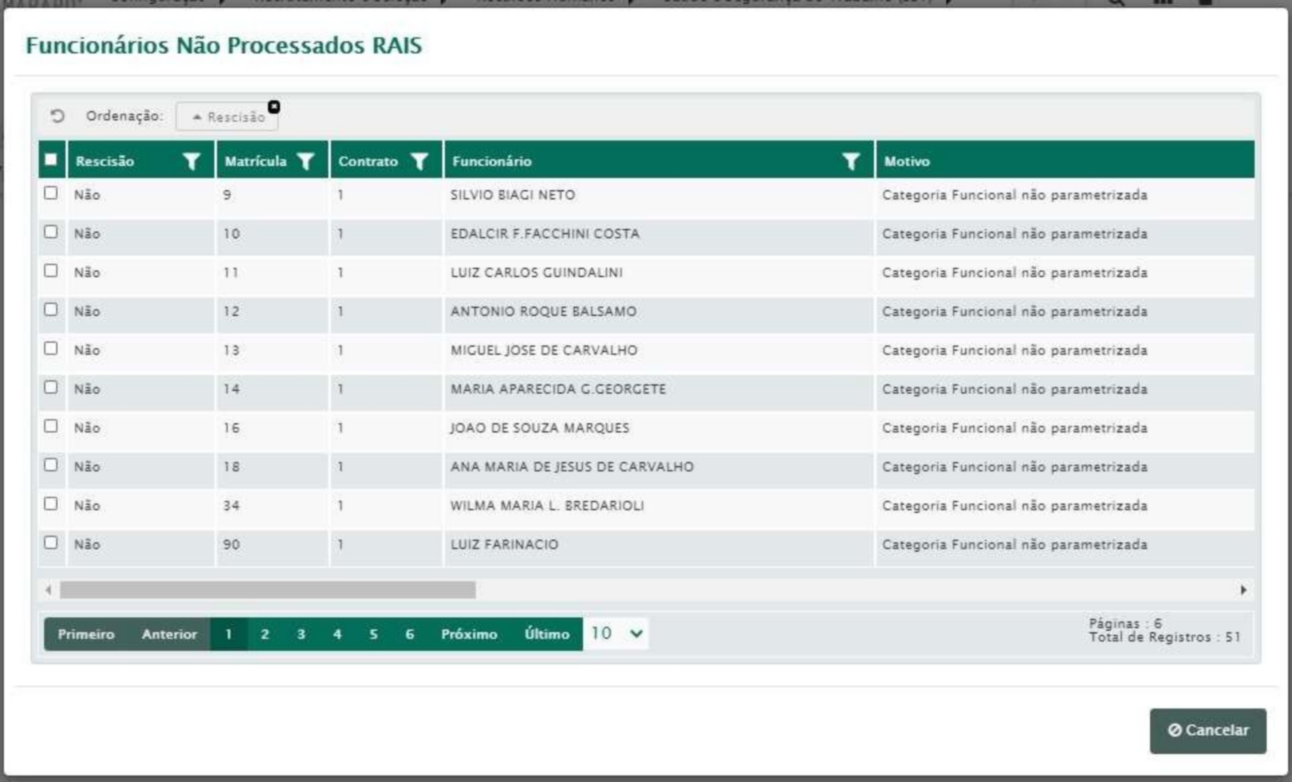 Os funcionários não gerados (Figura 26) são listados por Matrícula, e para cada registro, consta na lista o motivo pelo qual cada registro não foi gerado. Para facilitar a verificação, o usuário pode utilizar os filtros disponíveis no grid.